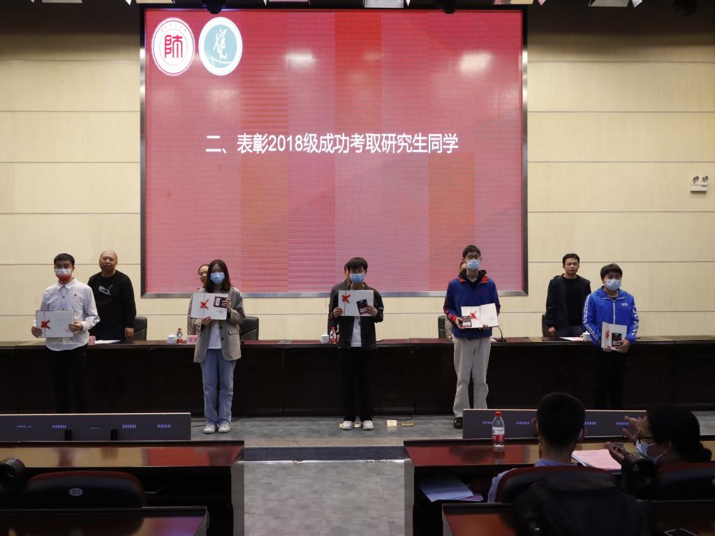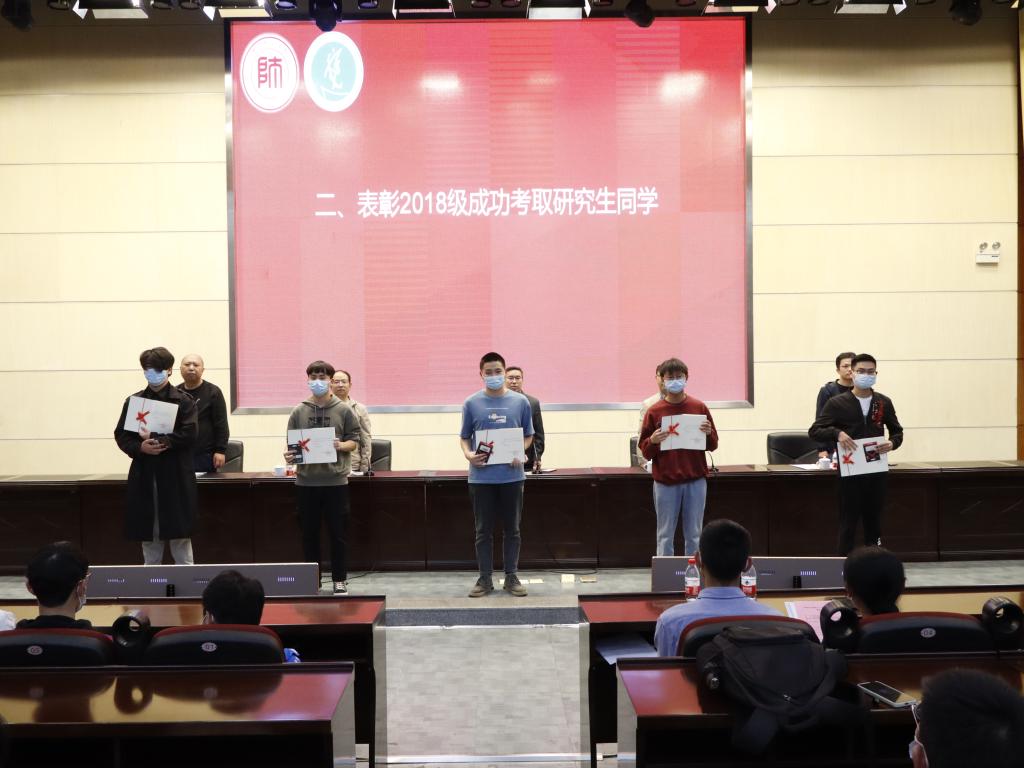 大会在雄壮的国歌声中拉开序幕,首先由学院领导为2018级成功考取研究生的同学进行颁奖。随后,副院长张太华代表学院对同学们进一步考研深造表示鼓励与支持,他提醒同学们要坚定考研信念、奋力拼搏、坚持不懈,建议大家明确考研目标,并朝着目标不断努力。他指出同学们应当充分认清现今社会的就业形势,强化刻苦求知的意识,增强学习的自觉性,并嘱咐同学们只有经受住人生的考验才能赢得属于自己的精彩。