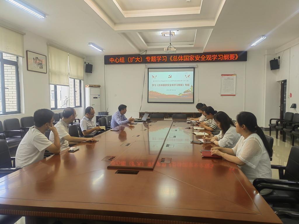 7月1日,必赢网址bwi437党委理论学习中心组(扩大)专题学习研讨《总体国家安全观学习纲要》(以下简称《纲要》),深刻领会总体国家安全观的重大意义、核心要义、精神实质、实践要求。学院党委书记郑继明主持学习研讨会,学院党委委员、全体师生党支部书记参加学习和集体研讨。