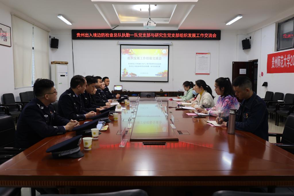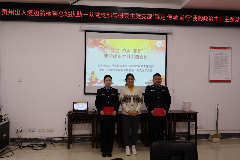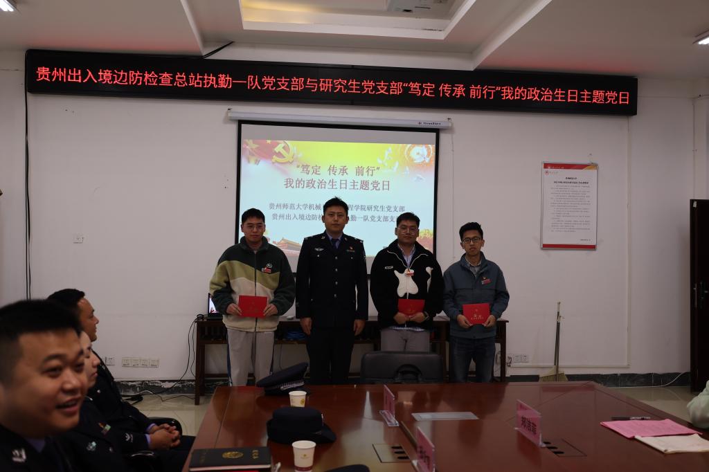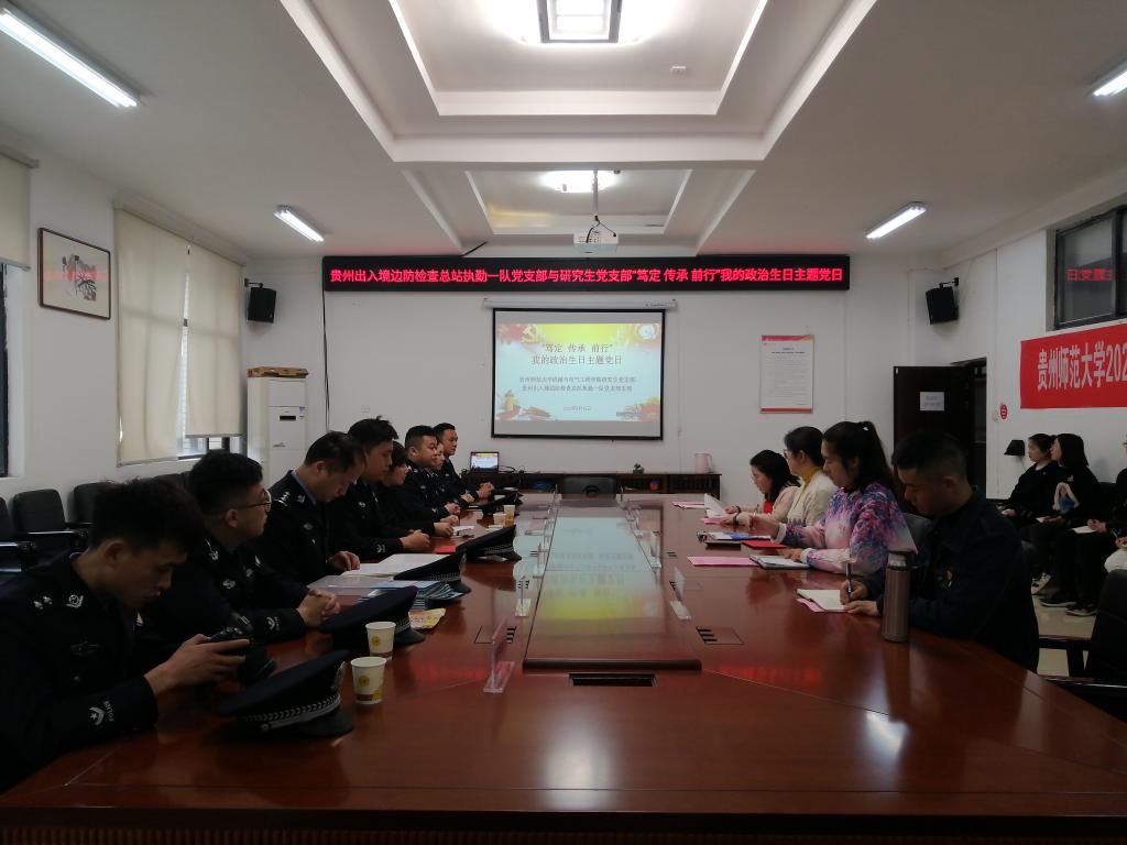 为认真贯彻落实党的十九大精神、十九届五中、六中全会精神、《中国共产党支部工作条例(试行)》、《中国共产党党员教育管理工作条例》、《关于推进全省党支部标准化规范化建设的实施意见》以及省委组织部、省委教育工委有关精神,为深入开展支部共建活动,强化党员的身份意识和责任意识,加强党员党性教育,进一步激发党员的政治热情,增强党员的责任感和使命感,强化党员的宗旨意识,让广大党员始终保持党的先进性和纯洁性,充分发挥党员先锋模范作用。4月15日,贵州省出入境边防检查总站执勤一队党支部与我院研究生党支部在花溪校区机电学院8322会议室开展结对共建暨“笃定 传承 前行”我的政治生日主题党日活动,共建双方党支部全体成员共同参加,研究生党支部书记邢丹花主持。